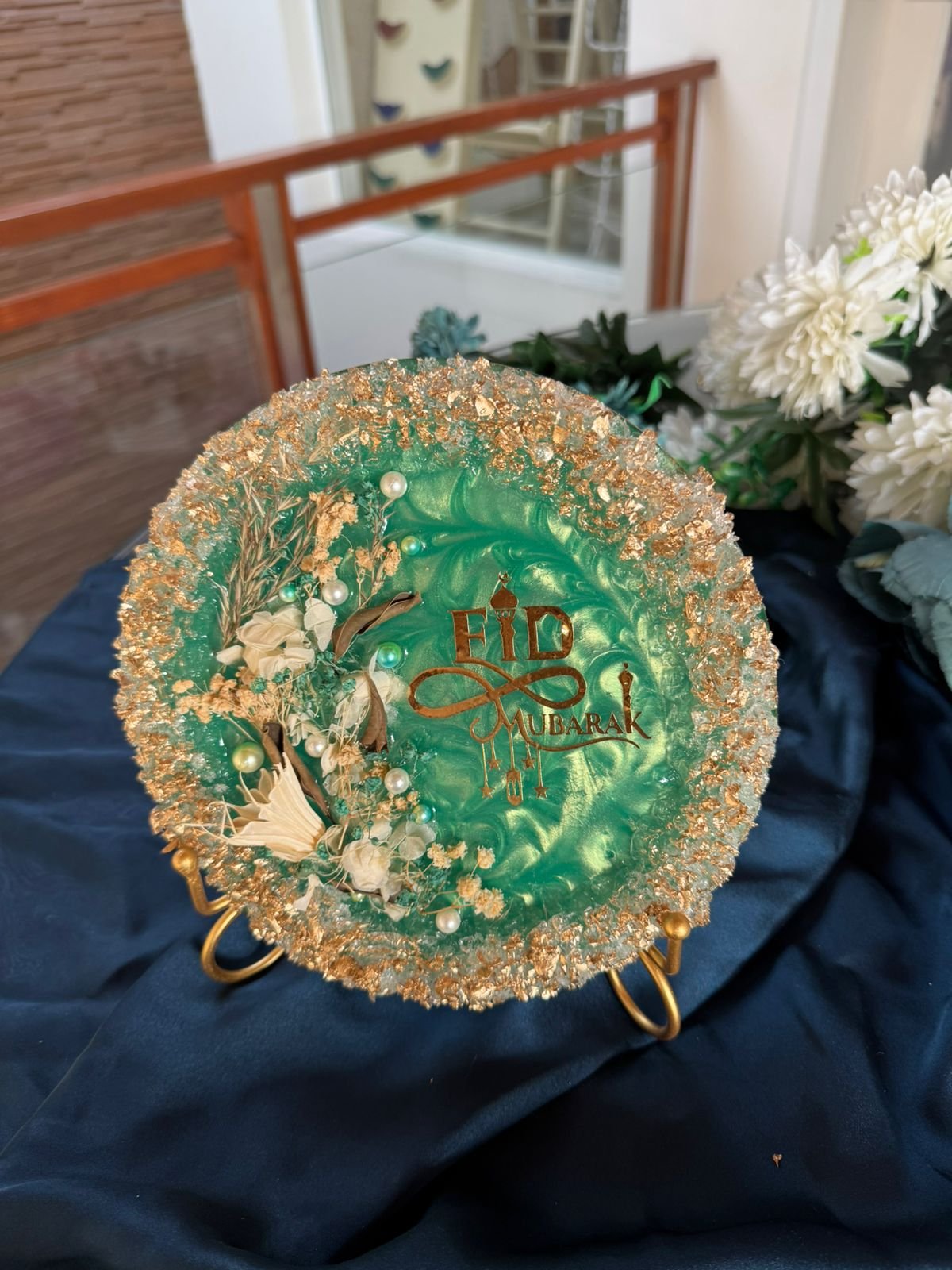 Celebrate Eid with these beautifully handcrafted resin coasters featuring a soft blend of green and clear tones. Accented with shimmering gold foil, delicate florals, and elegant “Eid Mubarak” detailing, each piece radiates festive grace. The partial green design adds a modern twist while preserving a timeless charm—perfect for decorating your table, serving guests, or gifting during the season of joy. A refined addition to your Eid décor collection.